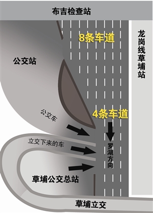 “布吉检查站共有5个入口,每个入口可以行驶2辆车,可是到了不远处的草埔立交,就缩为4车道,相关部门应该提前做好应对,提前慢慢来缩小车道,避免一突然减少车道形成瓶颈。”家住布吉的何先生近几年来饱受堵车之苦。他建议,进入布吉检查站后,为避免小汽车、货车和公交车穿插,相关部门可以用铁栅栏将公交车和普通车道隔开至草埔立交处,以避免公交车一出车站就和社会车辆穿插。“布吉进关处是最混乱的地方,本来应该有交警在这协调指挥,但往往要到草埔立交甚至原布吉农批市场那边才看得到交警。”