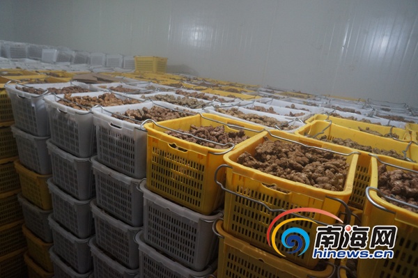 白沙邦溪镇姜茶加工厂的冷库里堆放着白沙农民种植的生姜,种植生姜的效益比种木薯和甘蔗都好。(南海网记者李庆芳摄)