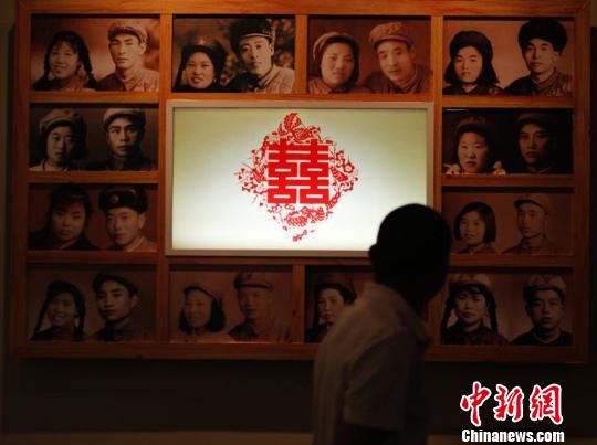 石河子军垦博物馆内,一组支边女青年与兵团屯垦战士结婚照前,参观游客走过。 许云峰 摄