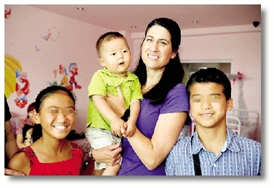 ▲好莱坞明星詹姆斯·卡维泽的妻子凯莉和他们收养的3个孩子,凯莉怀抱的就是刚刚收养的郑州市儿童福利院的2岁半男孩寅晖。