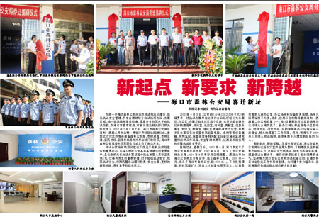 为进一步推动森林公安队伍的执法规范化建设,强化执法安全管理,科学合理地划分执法场所办公、办案区域,统一执法场所建设标准,提高安全防范水平和执法效能,在海口市委市政府、市林业局及相关部门的关怀支持下,2012年7月9日上午,海口市森林公安局在海甸一西路二号办公楼一楼举行乔迁新址揭牌仪式。参加这次仪式的有海南省森林公安局、市财政局、市林业局、新民林场、新海林场等相关单位部门的领导。海口市森林公安局局长王芙蓉在仪式上作了表态发言。