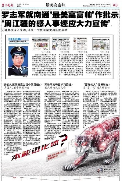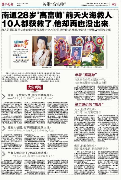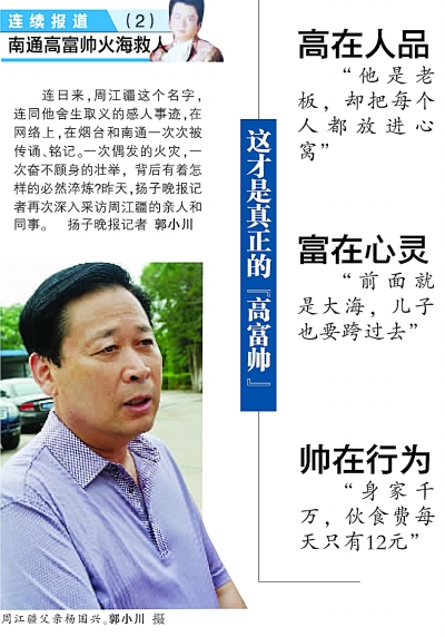 7月的江海大地酷暑当头,来自中央、省和地方媒体的数十位记者再次云集南通,深入通州、海门两地公司、农村和学校,进一步深入采访火场英雄、“最美高富帅”周江疆的感人事迹。连日来追踪报道周江疆壮举的扬子晚报记者,在获知许多个关于周江疆的鲜活事例后,不禁陷入深思:是一种什么力量,让周江疆不顾生死,二次冲进已熊熊燃烧的火场,直到自己倒下?这个有点“异类”的“英雄富二代”,汲取了什么营养,让他短暂的人生在最后时刻瞬间闪光?培养英雄的江海土地上,有着怎样的土壤和生态,让凡人善举不断涌现?回答这些,或许能进一步诠释“最美高富帅”的精神内涵。