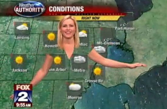 为什么电视台气象女主播从来没有穿过绿衣服?美国福克斯电视二台气象女主播近日尝试穿着绿衣服,竟营造出“隐身”效果,场景相当滑稽。【更多】