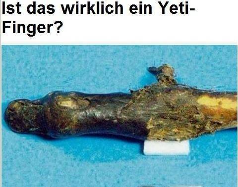 2011年12月,科学家们在尼泊尔发现一根神秘的手指骨骼,怀疑这是“喜马拉雅山雪人”的遗骸。这根手指被尼泊尔当地的僧侣当做“吉祥物”供奉起来。科学家将把它拿到伦敦一家博物馆进行DNA测试,以证实其是否是“雪人”的手指。【更多】