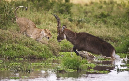 在肯尼亚的马赛马拉国家公园,摄影师拍摄了一组照片,展示一头水羚成功击退母狮的精彩瞬间。当时,一头母狮逼近池塘中的水羚,试图让它变成一顿美餐,结果遭到水羚的激烈反抗。面对母狮锋利的牙齿,水羚表现出毫无畏惧的一面,用长角展开回击,最后成功击退母狮。【更多】
