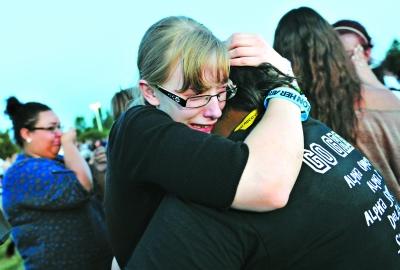 7月20日,在美国科罗拉多州奥罗拉市,高中学生在事发现场附近相拥痛哭。