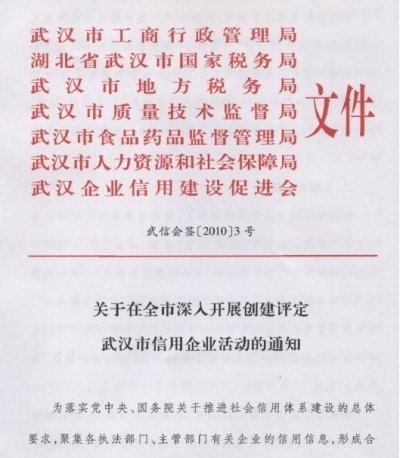 武汉市质量技术监督局 武汉市食品药品监督管理局 武汉市人力资源和社会保障局 武汉企业信用建设促进会