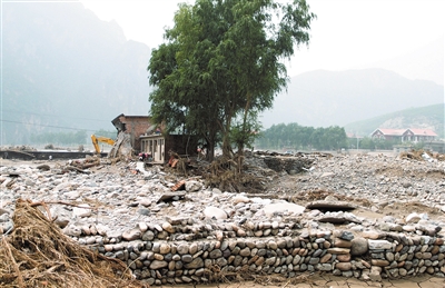 7月26日,河北涞水野三坡百里峡景区,一家卡丁车场被冲毁,洪水之前,车场所建房子位于河道中央。新京报记者刘一丁摄