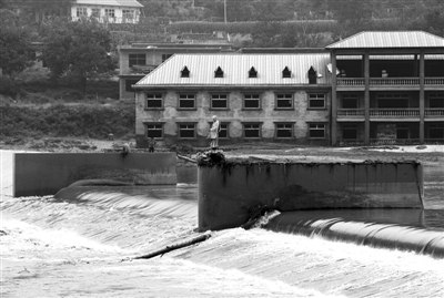 7月24日,河北涞水野三坡,橡胶坝中间的水泥坝体上原建有“八仙”雕塑,洪水过后,只剩下“一仙”。 实习生王飞摄
