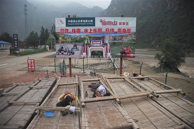 7月27日,仙西山旁的拒马河边,村民躺在广告牌前的竹排上休息。洪水前,这里曾是“水上乐园”。 新京报记者王嘉宁摄