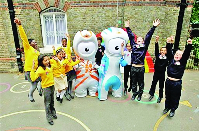 伦敦奥运吉祥物“文洛克”和小镇上的孩子们。