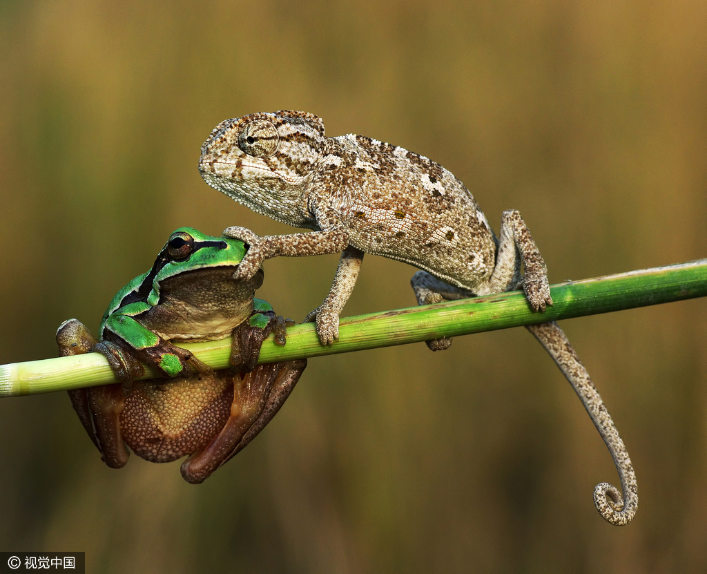 2016年5月24日消息(具体拍摄时间不详),土耳其,一只叫声吵人的青蛙惹一只变色龙烦心,变色龙顺着树枝爬过去直接堵住青蛙的嘴。