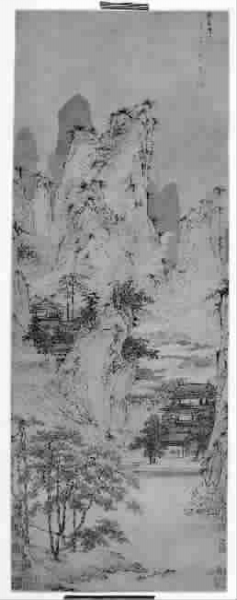 仇英于绘画六法精通,山水、人物、花鸟皆擅,而尤其以人物中之仕女、山水中之青绿为世人所重。这张《仙山楼阁图》正是仇氏典型的青绿山水。仇英的山水画,继承的是两宋整饬精工的“院体”风格,此画山石硬朗峭利,笔法上以李唐、刘松年的小斧劈皴为主,相比仇英一些完全临古的作品,笔意显得较为随意疏简。近景处的几棵松树,枝干多节而虬曲,骨意嶙峋,颇有几分马远、夏圭的趣味。远景的山峦不作皴笔,直接以墨色及花青渍染而成,这正是南宋院体山水的一个特色,仇英在他的青绿山水中也多有沿用。文人山水多重画外之意,追求笔墨情趣,于物象多不甚留意,因此山水中的屋宇楼观多只逸笔草草,取其意到。而仇英则不然,山水中作极精工的界画楼阁,堪称是其一绝,如故宫博物院藏《临溪水阁图》、《临萧照瑞应图》、台北故宫博物院所藏《汉宫春晓图》等等。此图仇英自题名为“仙山楼阁”,可见楼阁与山水并重,也是画面上极重要的元素。楼阁在画面中景处,山脚与山腰各有一处,以石桥石阶相连,其重重屋宇,鳞次栉比,大至廊柱庭台,小至桌椅摆设,都以谨细精工的线条一一画出,真可谓巨细无遗,锱铢尽显。不过界画一道,难在精准细腻,但最高境界却不是只有精准细腻,只有使线条既精工又有生气,使描绘的物象既细腻又不刻板,才能化无情为有情,在精工细腻之外显示出闲情逸致。这张《仙山楼阁图》中的宫观便是如此,形制古雅,赋色清淡,真有一派出尘的仙家气派,这种气质却是仇英濡染了当时吴门画派的儒雅气息,令他的界画也有了脱俗的意境。不仅宫观的色彩质朴清淡,整张《仙山楼阁》图的设色也是以淡雅为主。仇英的青绿山水取法赵伯驹,董其昌说他是“赵伯驹后身,即文、沈亦未尽其法”,所谓的文(征明)沈(周)未尽其法,指的是其设重色的青绿山水,而类似于这张《仙山楼阁》图的、带有文人气息的设色方式则恰恰是受到文、沈,尤其是文征明的影响。继承两宋“院体”绘画的高超技艺,同时汲取文人画的秀雅气息,这正是仇英画雅俗共赏、广受喜爱的原因。