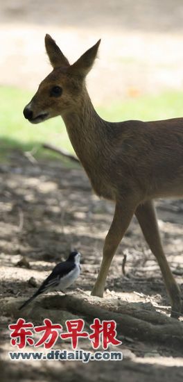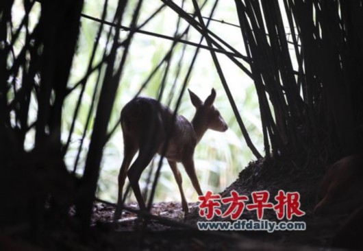 东方网8月6日消息:据《东方早报》报道,獐,被认为是最原始的鹿科动物,目前沿海广大滨海平原唯一野生的鹿科动物,更是上海原土著物种,在新石器时代上海就有獐的分布。图为2012年8月4日,华夏公园里的一只獐。本版图片 早报记者 王炬亮