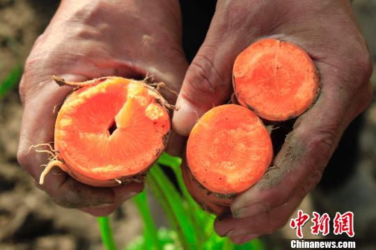 赵文和介绍说,“品相好的胡萝卜根应该是圆的,也就是种植户们所说的收尾好、条形好、无木质化、外表无疙瘩、肉厚、芯细、三红(皮红、芯红、肉红)。”