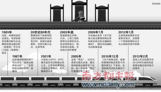 在全国18个铁路局(包含广铁集团和青藏铁路公司)中,除青藏铁路公司没有司法系统,其余均设有两级铁路运输法院和检察院:17个铁路运输中级法院、17个铁路运输检察分院,还有其下属的基层法院和基层检察院各接近60个———据最高人民法院透露,在改制过程中,铁路系统向地方移交资产共计70余亿元人民币。