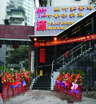 于是,王总便带领厨师团队多次到贵州,不惜对熬制底料反复调味。最终将贵州特有的数十种中草药和调料香料,与重庆的麻辣味水乳交融,且在锅中加入鲜嫩爽脆的金竹笋,将黑白两竹笋搭配着鸡肉做火锅。这满锅红艳艳的竹笋鸡,透着清爽的星星油亮,丝丝麻味顺着舌尖弥漫开去,辣嘴不辣胃,非常过瘾。2000年,竹源·黑竹笋香鸡在小龙坎一亮相,便博得满堂彩。这种香鸡现点现做,绿色、营养的美味吃法,很受食客喜欢。