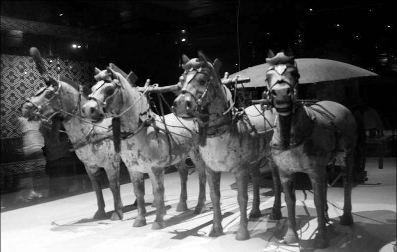 秦始皇兵马俑目前已出土陶俑千余件,预计存量可达到8000件。在这浩大的铁骑兵团中,迄今为止,却仅仅出土过 1组两件彩绘铜车马,极其稀有外加华美异常,堪称秦陵馆当之无愧的镇馆之宝。