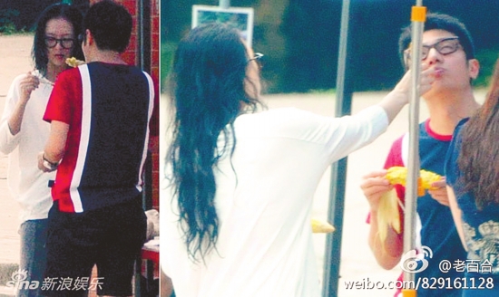 撒贝宁与章子怡互相喂食玉米的甜蜜照