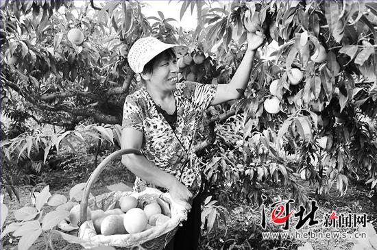 怀来县北辛堡镇素有“水果之乡”美称,林果业是全镇的主导产业。近年来,该镇不断调整优化农业产业结构,目前已形成久保桃、红富士苹果、鲜食葡萄、香椿和大棚草莓五大产业基地。图为蚕房营村农民程淑萍在喜摘丰收的久保桃。 陈浩 朱炅摄