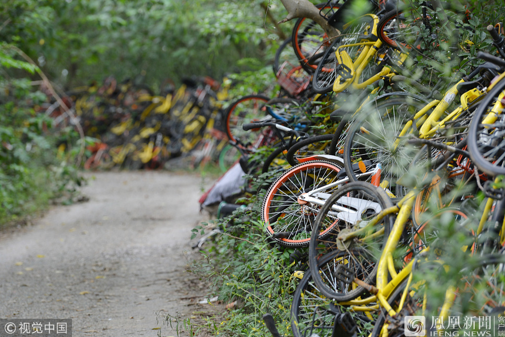 8月27日报道,2018年8月26日,南京江宁区静龙山的一条无名山路上堆放着数千辆共享单车。