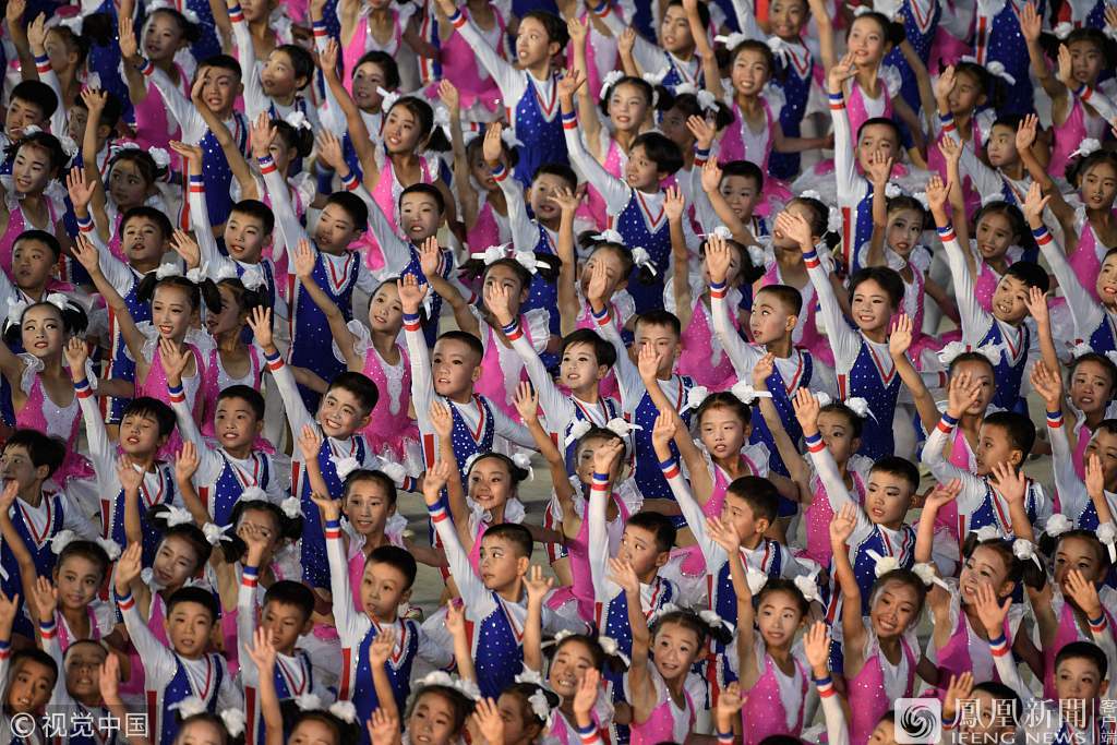 当地时间2018年9月9日,朝鲜平壤,朝鲜庆祝建国70周年,举行大型团体操“辉煌的祖国”表演并燃放烟花。来源:视觉中国/新京报