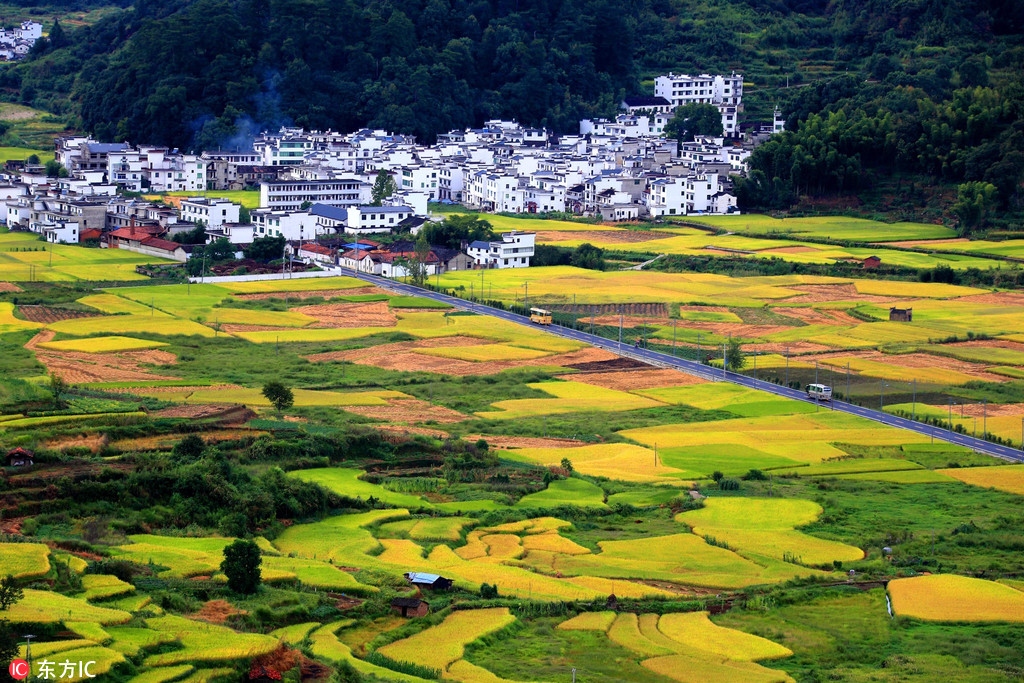 9月18日报道,9月17日,在江西省婺源县篁岭村拍摄的金黄灿灿的稻田。来源:施广德/东方IC