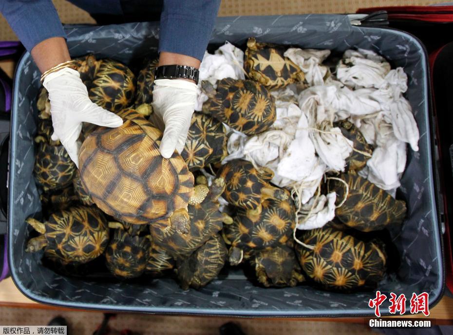 当地时间2017年5月15日,马来西亚雪邦,马来西亚海关官员阻止了一起濒危陆龟走私入境,截获数百只陆龟。