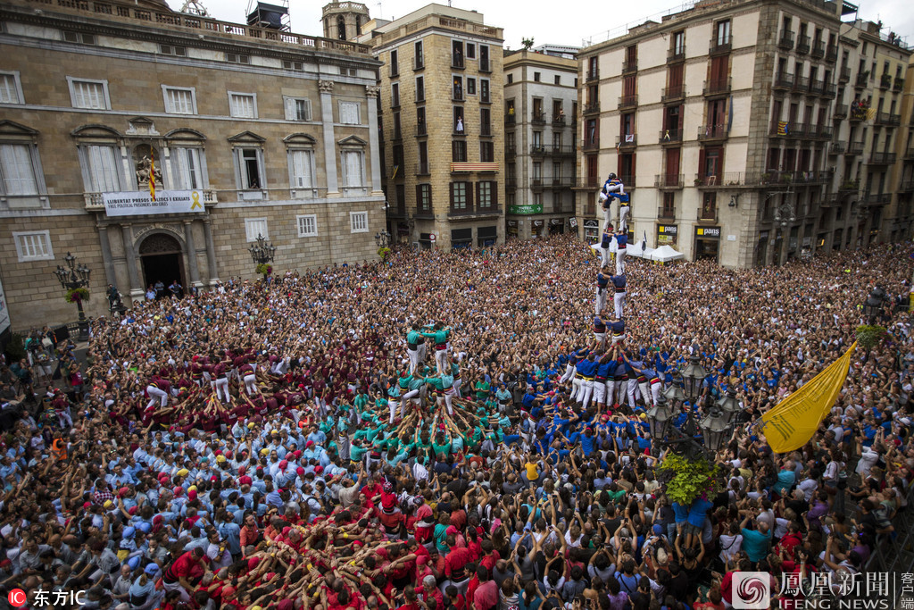 9月25日报道,9月24日,西班牙巴塞罗那,当地民众庆祝圣梅尔塞节,举办惊险刺激的“叠人塔”(Castells)比赛。来源:Matthias Oesterle/东方IC