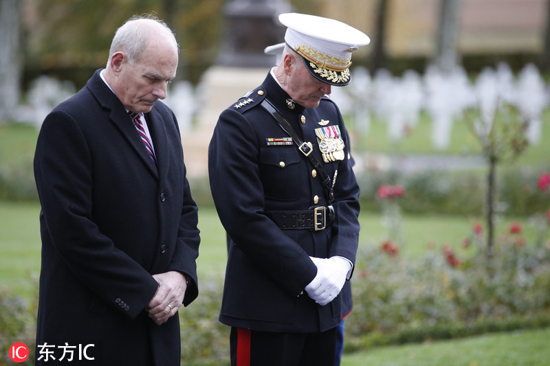 当地时间2018年11月10日,法国贝洛林苑,美国总统特朗普和妻子梅拉尼娅因下雨取消了前往一战美军公墓的行程,美国白宫幕僚长约翰·凯利和美国参谋长联席会议主席邓福德将军代替前往美军公墓,纪念一战结束100周年。 有媒体称,特朗普的缺席是对在一战中战死的美国士兵的不尊重。