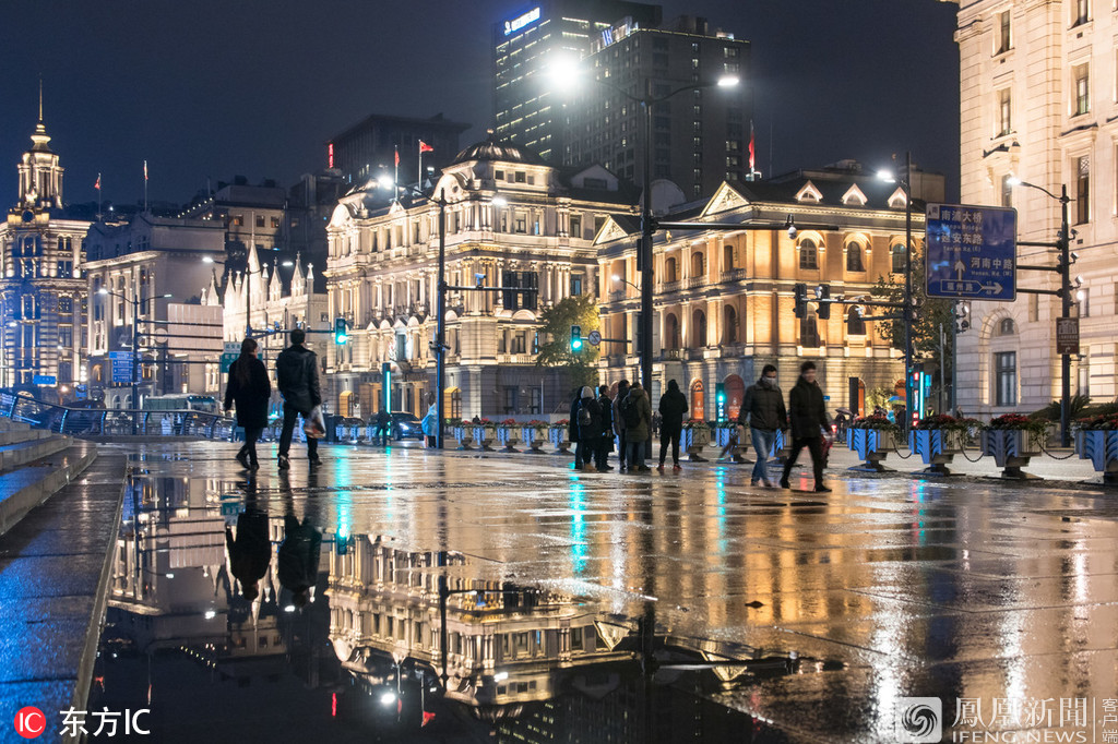 12月12日报道,12月11日, 上海 ,当天下午5时许,外滩附近华灯初上,中山东一路沿线的百年历史建筑在雨水中的倒影显得相当亮丽,城市风景分外迷人。来源:东方IC