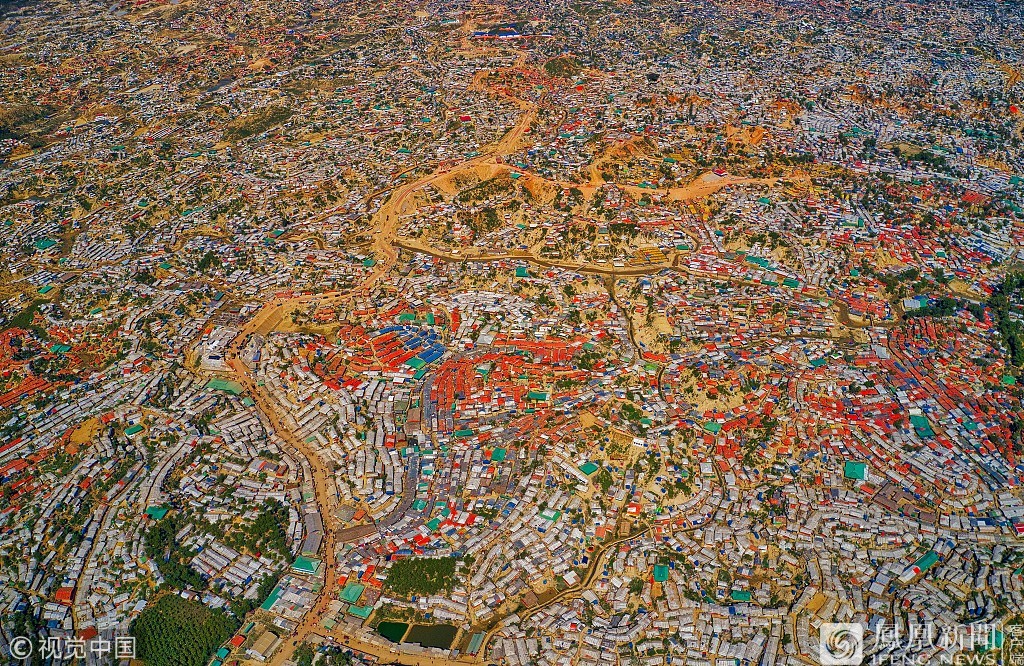 12月21日报道,具体拍摄时间不详,孟加拉国科克斯巴扎尔,业余摄影师Azim Khan Ronnie航拍Kutupalong难民营。这里有成千上万的临时住所,绵延数英里的红、绿、白三色房屋,容纳着100多万逃离暴力的难民,堪称世界上最大的难民营。来源:视觉中国