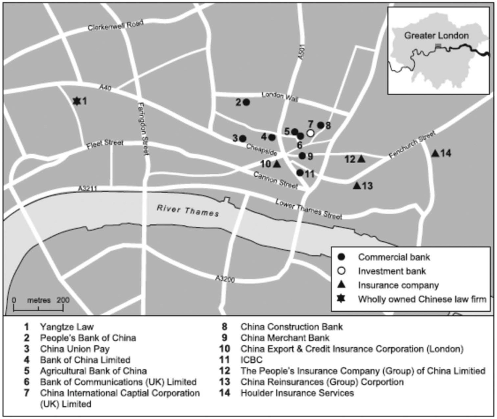 除了移民个体之外,霍尔还关注了在伦敦运营的中国金融机构的位置。既往研究清楚地记录了国际化浪潮如何形塑了伦敦金融区的工作实践和相关城市形态。这一过程的特点是,国际金融服务公司从靠近英格兰银行的伦敦金融区的历史中心向东扩展到金丝雀码头,而对冲基金公司、资产管理公司和私人财富管理公司则向北和向西扩展。