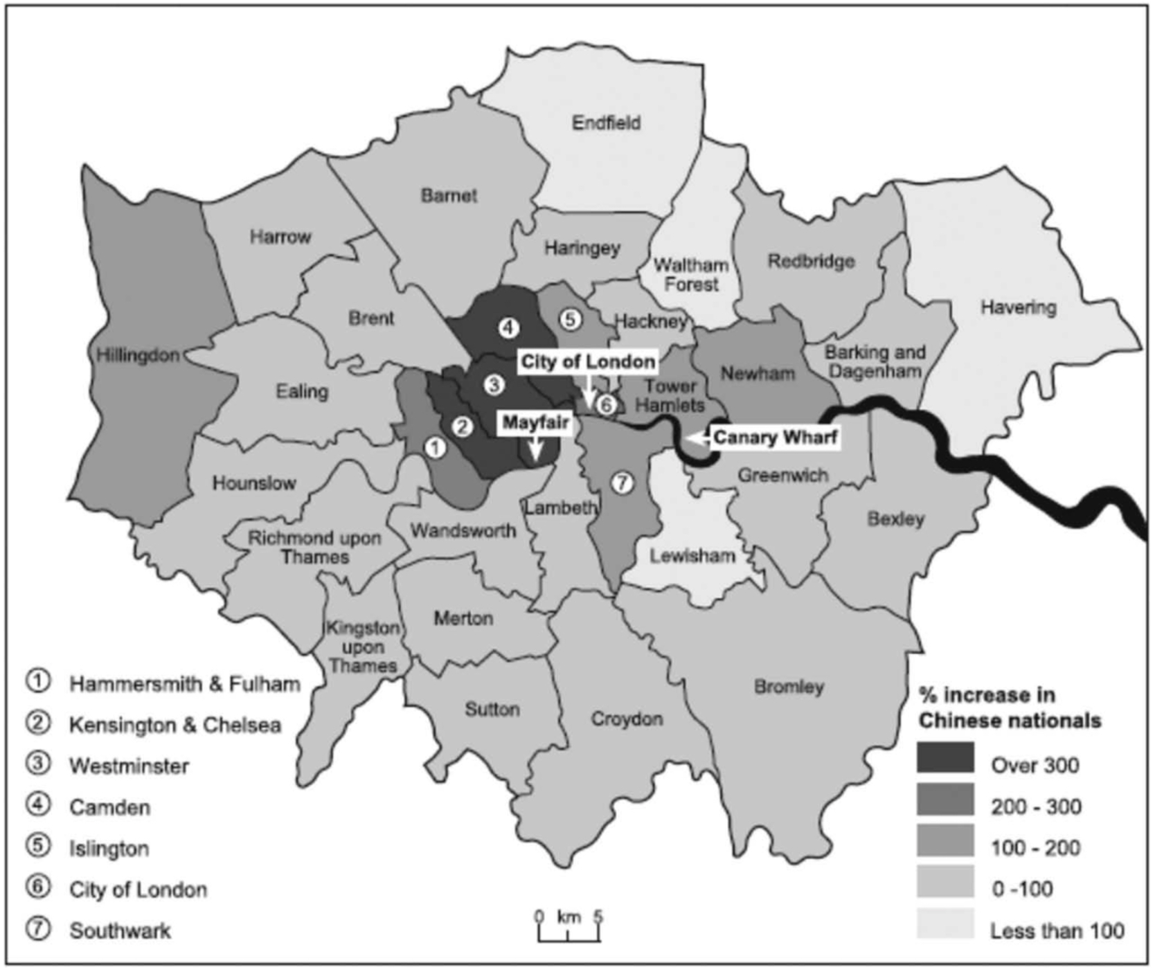2012年度至2015年度期间,中国流动人口每年注册人数增幅最大的行政区是卡姆登(438%)、威斯敏斯特(406%)、肯辛顿-切尔西(332%)、哈默史密斯-富勒姆(246%)和伦敦金融城(220%)。