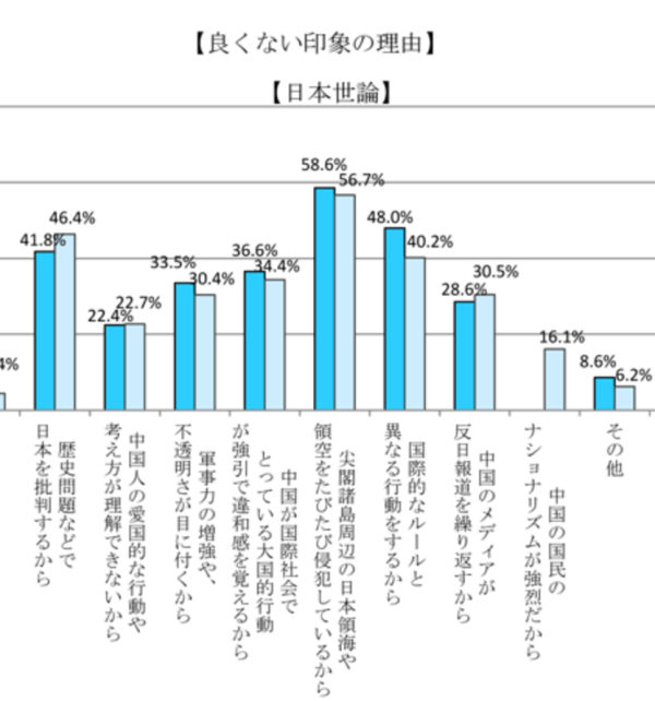 对中国抱有不好印象的理由的调查;蓝色柱为2018年,淡蓝色柱为2017年图/日本言论NPO