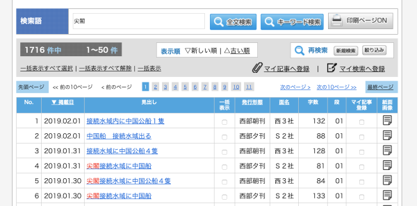 以日方的“尖阁”为例进行关键词搜索,将范围控制在2016年1月1日至2019年2月1日,《朝日新闻》中相关报道出现712次,大部分为报道“中国船只侵入尖阁海域”相关内容;而《读卖新闻》方面更多,出现1716次,内容也和《朝日新闻》的差不多,可以说这个报道频度相当之大,接近于平均每天都在报纸中提一嘴的程度了。