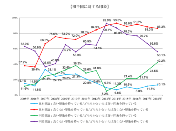 蓝线为日本民间对中国抱有好印象的比例,红线为日本民间对中国抱有不好印象的比例,绿线为中国民间对日本抱有好印象的比例,紫线为中国民间对日本抱有不好印象的比例。