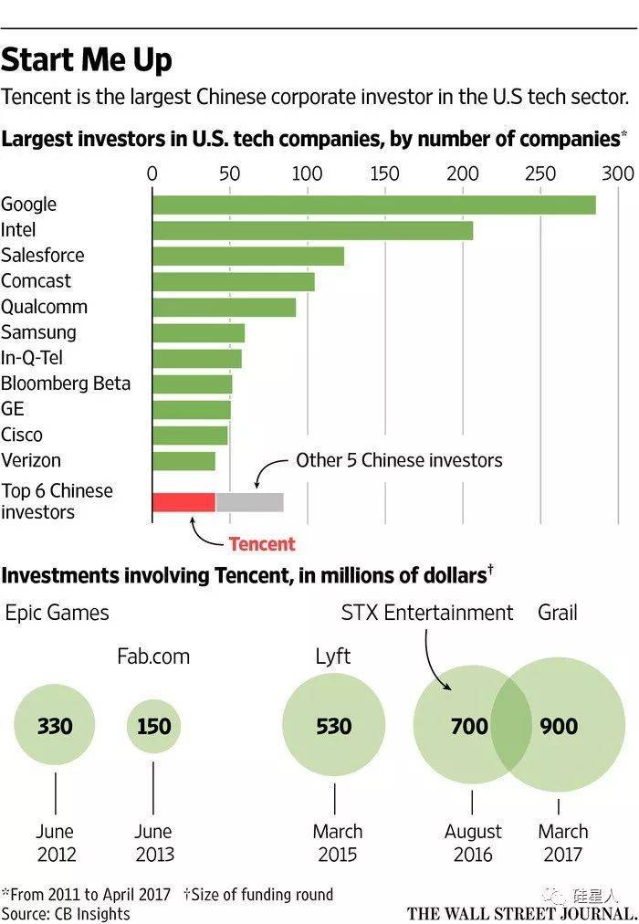 根据美国华尔街日报2017年的报道,如果算上美国本土公司,按投资美国科技公司的数量来说,腾讯可以排到第11名。