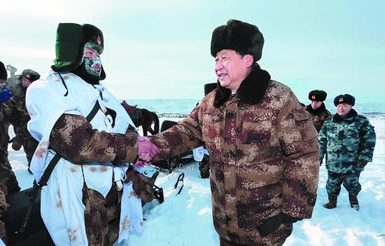 2014年1月26日,习近平来到祖国边疆的内蒙古阿尔山,冒着零下30多摄氏度的严寒,迎风踏雪慰问在边防线上巡逻执勤的官兵。来源:新华社