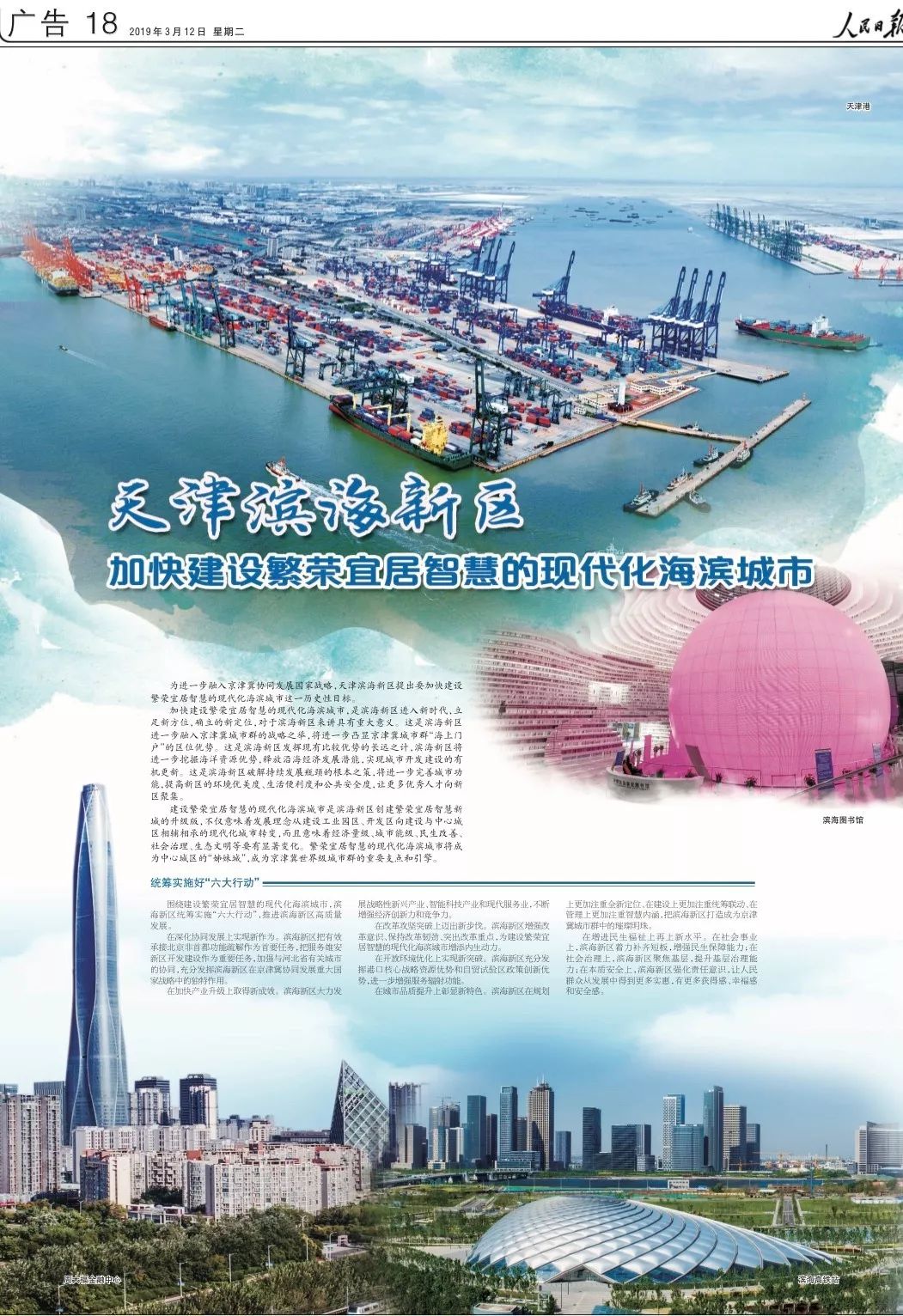 围绕建设繁荣宜居智慧的现代化海滨城市,滨海新区统筹实施“六大行动”,推进滨海新区高质量发展。