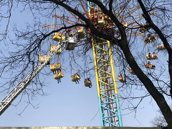 同日,长沙消防向澎湃新闻介绍,3月30日14时6分,长沙消防指挥中心接到报警称:长沙烈士公园一游乐设施发生设备故障,有人员被困。指挥中心立即调派伍家岭、特勤一、高桥、五星中队4台抢险救援消防车28名指战员赶赴现场处置。14时30分,伍家岭中队到达现场,经侦查发现,游乐设施因设备故障,悬在距地面20多米区间,有34人被困。随后,增援中队相继到场。现场正在用云梯车开展施救。 截至记者发稿前,据现场目击者介绍,已成功救出16人。17时50分所有游客被救出,无人受伤;设施启用五年安检合格,正查原因。