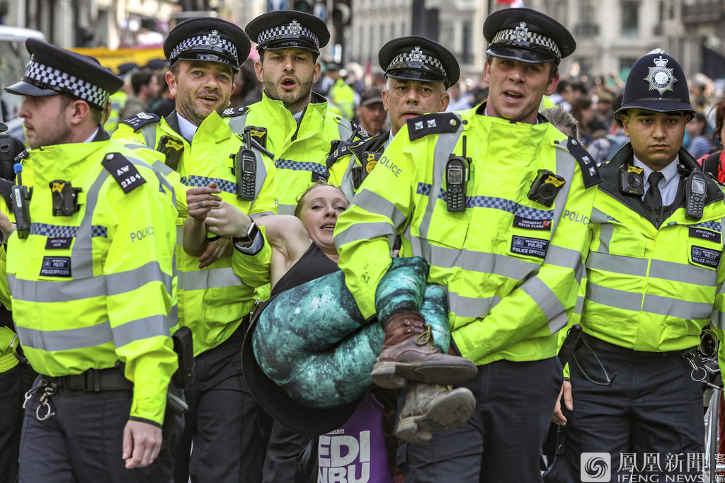 4月19日报道,当地时间4月18日,英国伦敦,气候变化活动人士继续示威,警方连拖带抬,逮捕多人。来源:东方IC