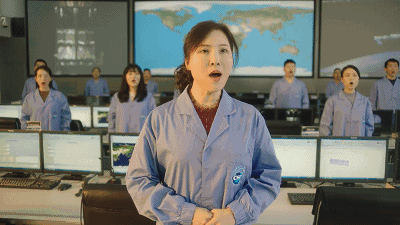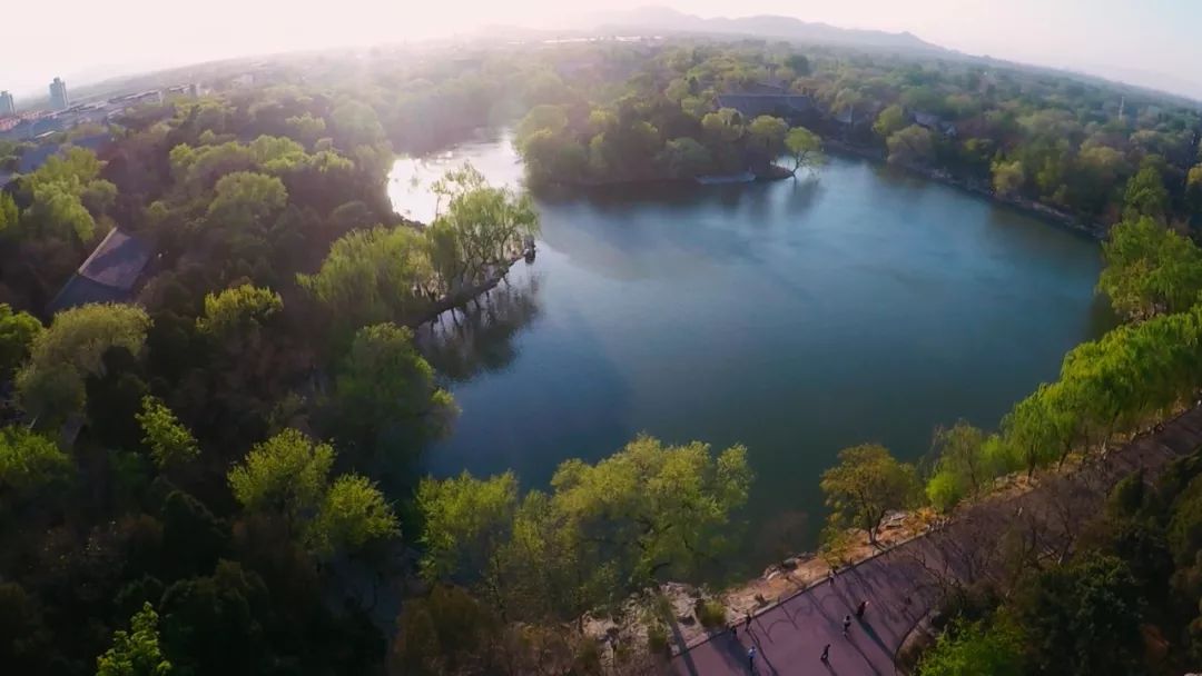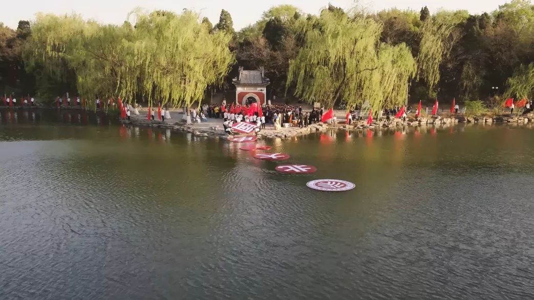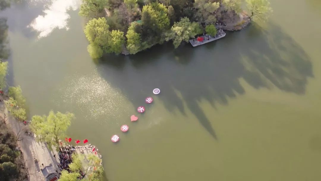 几百位旗手环湖奔跑,用手中的红旗摆出了心形图案,未名湖成了一颗红心