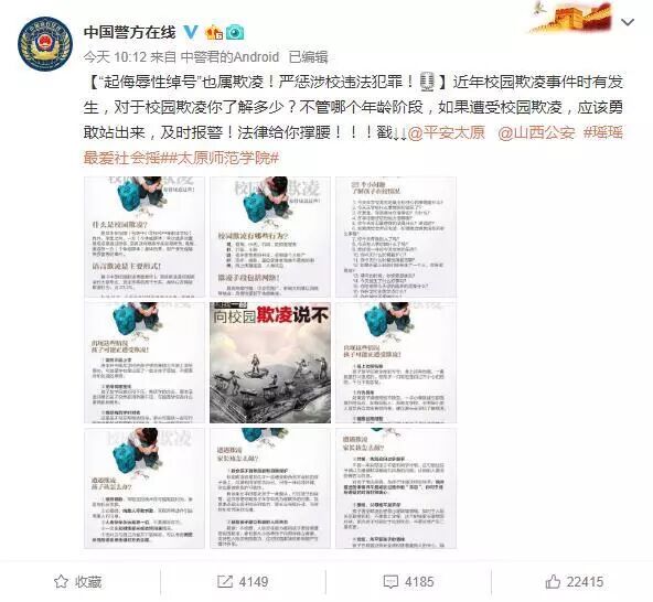 该微博一经发表,立即引发了诸多网友的关注,众多网友在转发的同时,也发声谴责校园暴力。公安部治安管理局也通过其官方微博@中国警方在线 对此事发表了评论,称“‘起侮辱性绰号’也属欺凌!严惩涉校违法犯罪!”。