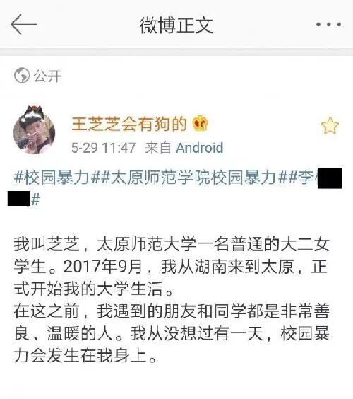 5月29日中午,一则太原师范学院大二女学生所写的求助微博在网上引发热议。该女生微博名为@王芝芝会有狗的 ,她在微博中自述遭受室友李某某和赵某长期校园暴力。该微博引发了网友的热议。