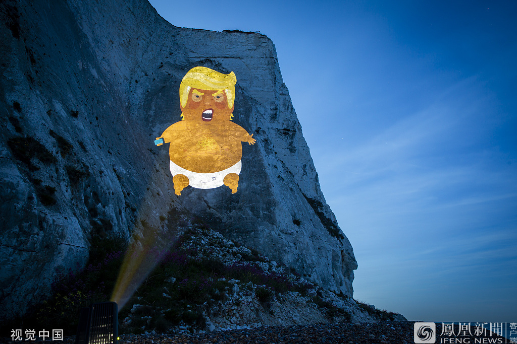 6月3日报道,当地时间6月1日,英国多佛,活动人士在当地著名的自然景观白崖上用投影展示“特朗普宝宝”的形象。6月3日,特朗普将开启对英“国事访问”。来源:Andrew Aitchison/视觉中国