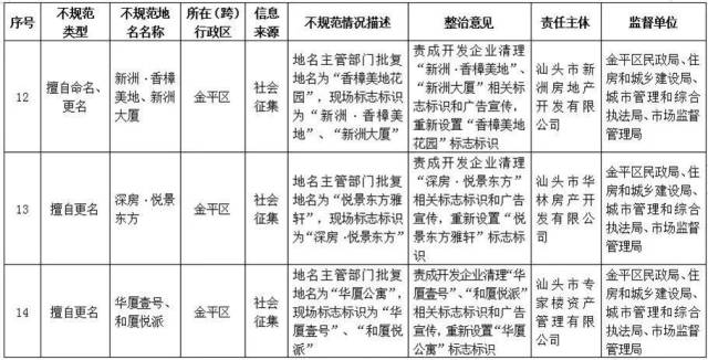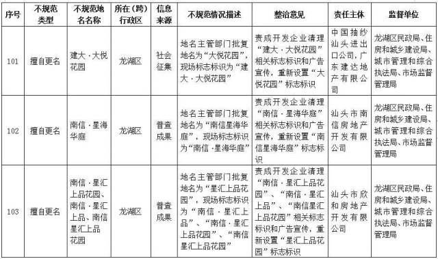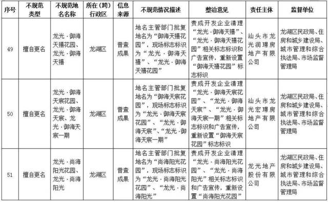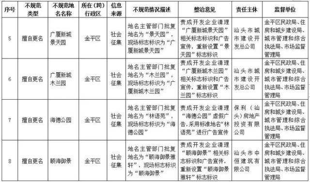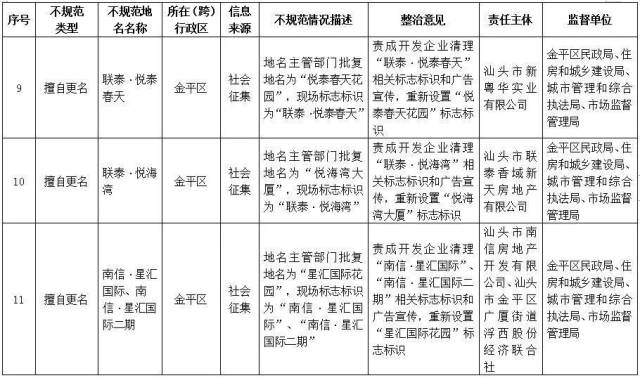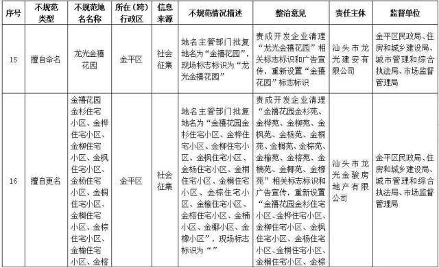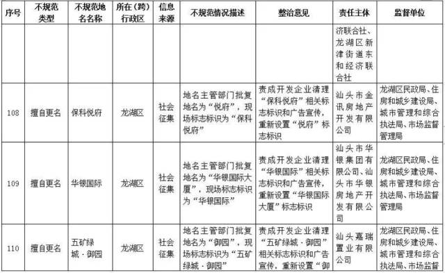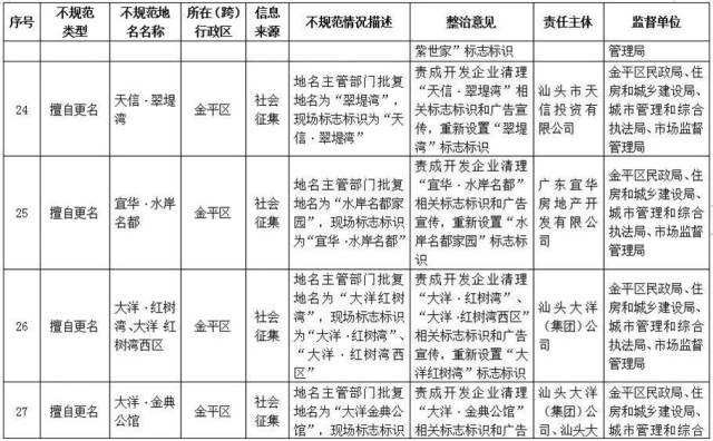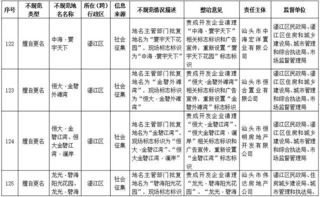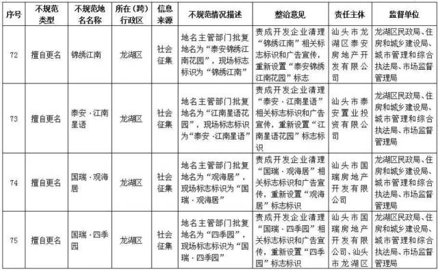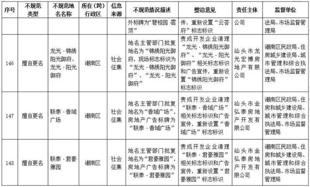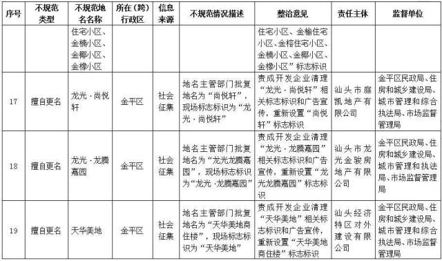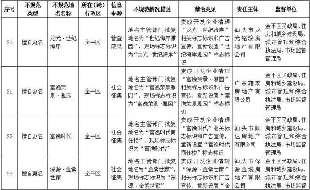 以汕头市为例,地名主管部门批复地名与房地产广告、工地户外标牌不一样,多家房地产企业存在擅自更名的情况。如地名主管部门批复地名为“锦绣阳光御府”,现场标志标识为“龙光·锦绣阳光御府” “龙光·阳光御府”。