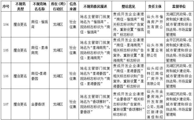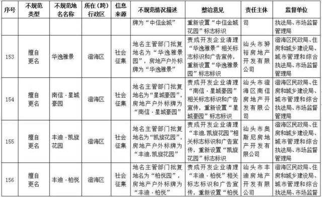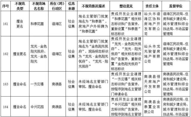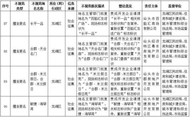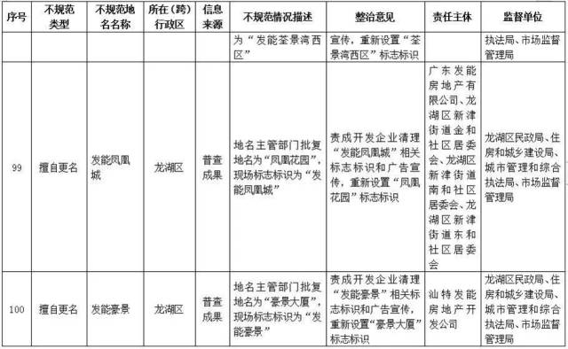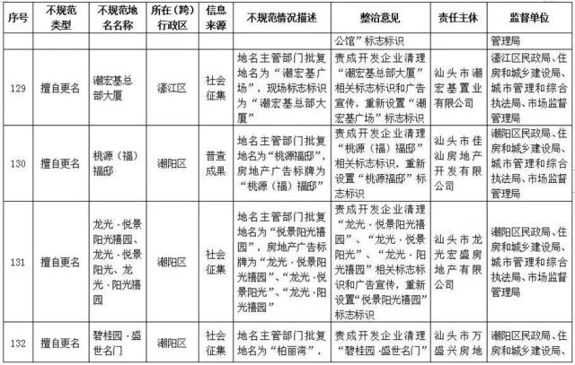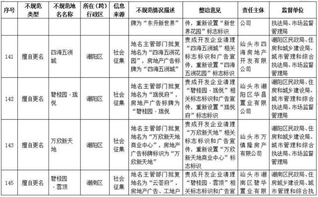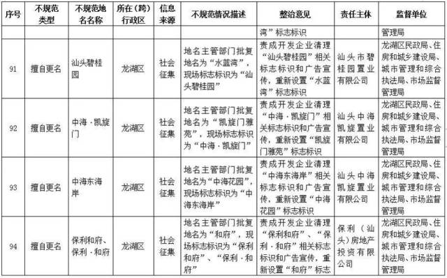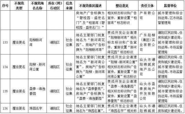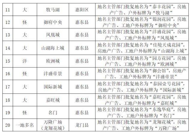 目前,广东省各市直有关部门排查、论证,认定了第一批不规范地名,包括广州、深圳、珠海、汕头、惠州、云浮等城市。其中,以位于广州番禺的“万科欧泊”楼盘为例,其被列入的不规范类型为“怪”,通告要求该楼盘清理非标准名“万科欧泊”相关标志标识和宣传资料,重新设置标准名“新光城市花园”标志。