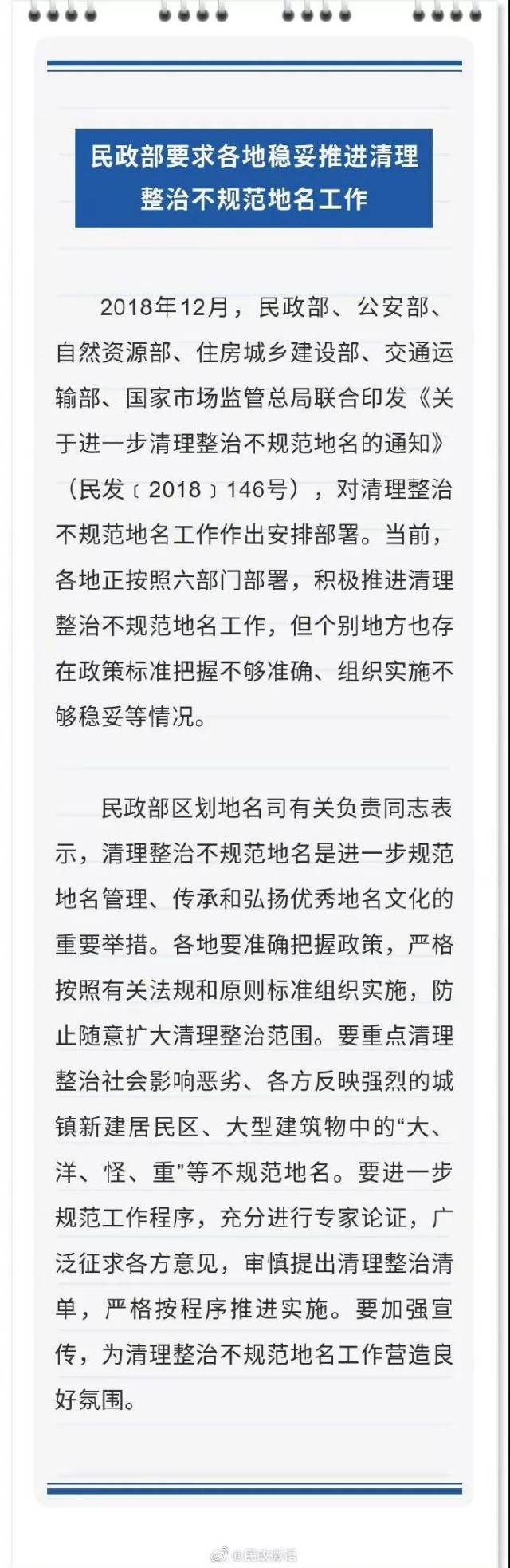 近日,全国多地开展清理整治不规范地名工作,对居民区、大型建筑物和道路、街巷等地名中存在的“大、洋、怪、重”等不规范地名,进行规范化、标准化处理,引起热议。