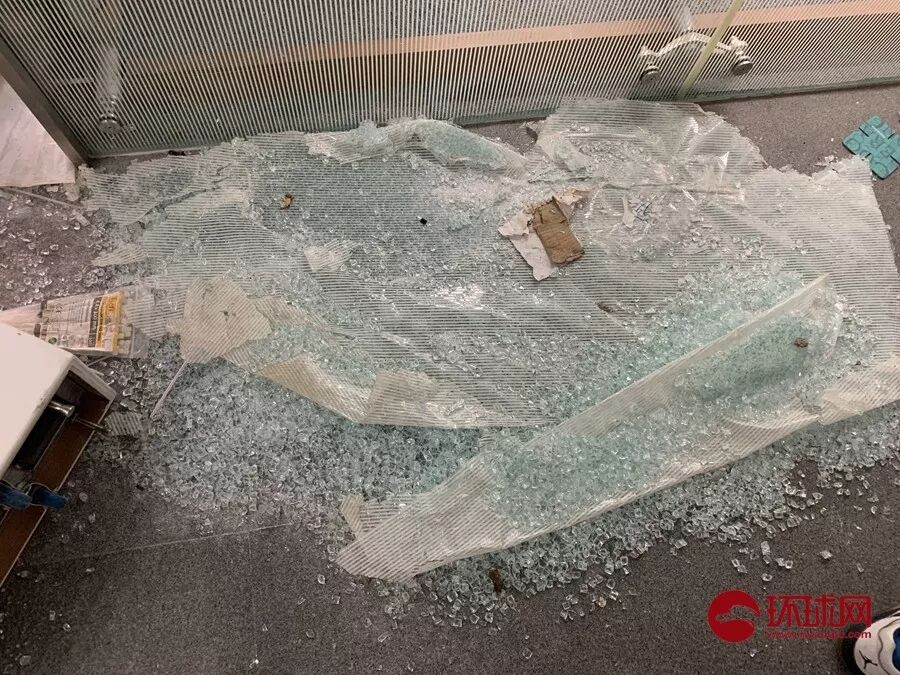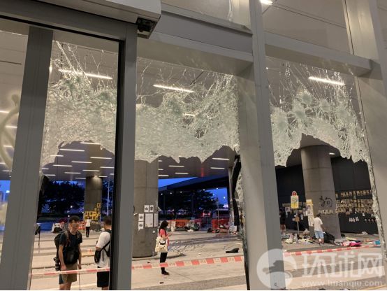 立法会侧门的玻璃全部被砸碎。记者通过时,工作人员提醒记者小心。
